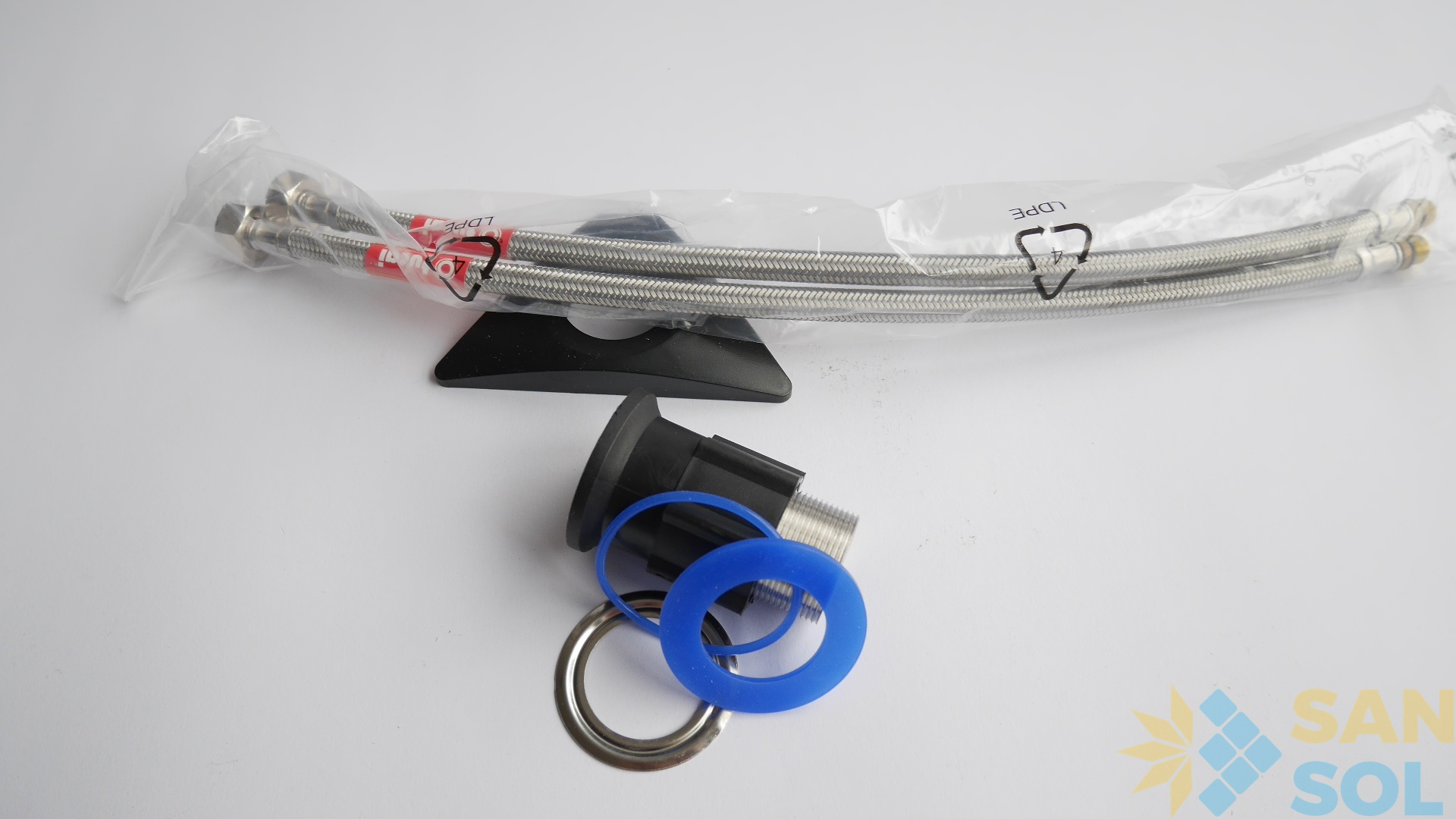 - W komplecie mocowanie i wężyki przyłaczeniowe o długości 40 cm, ruchomy szary wężyk do wylewki