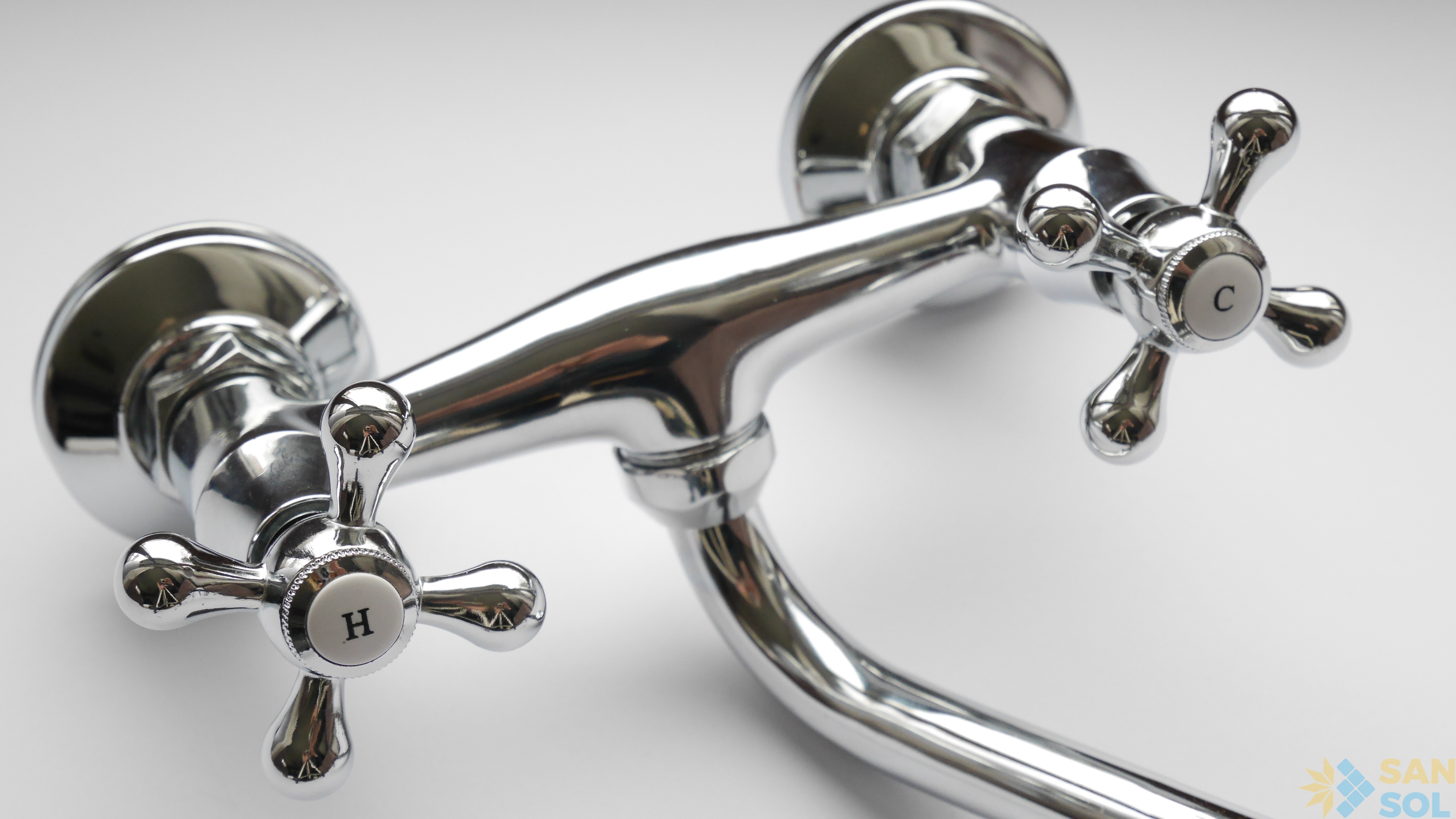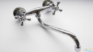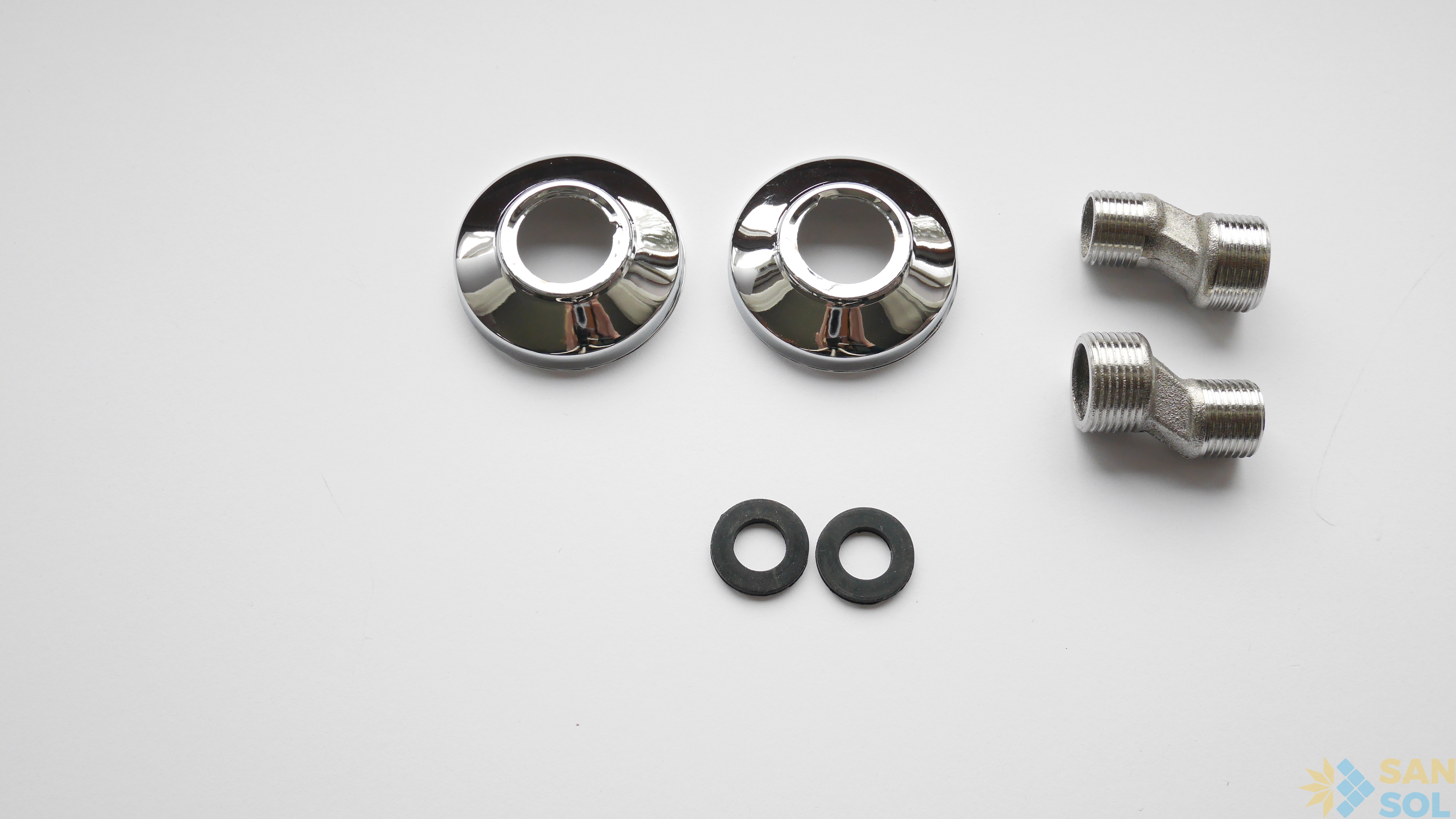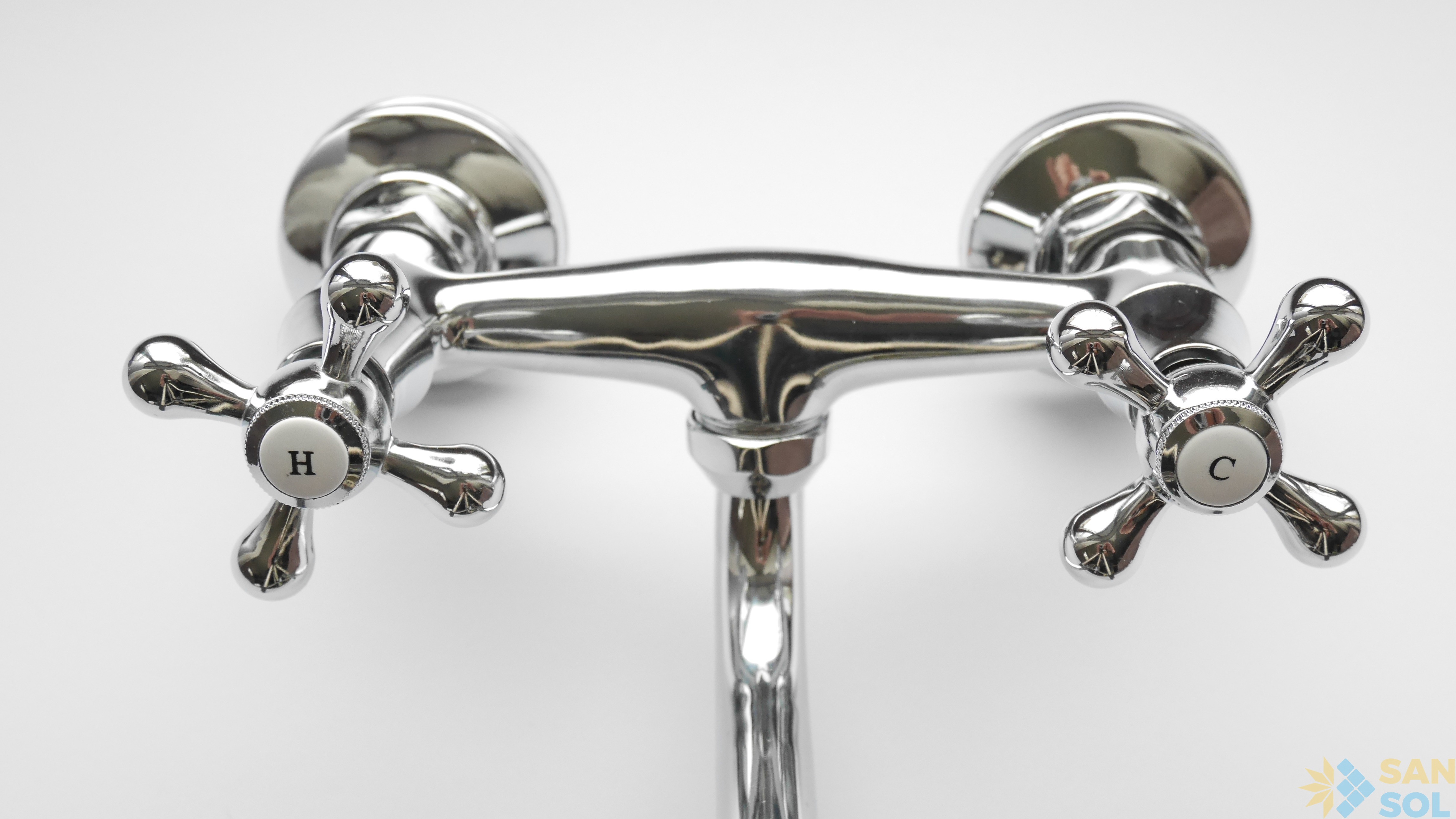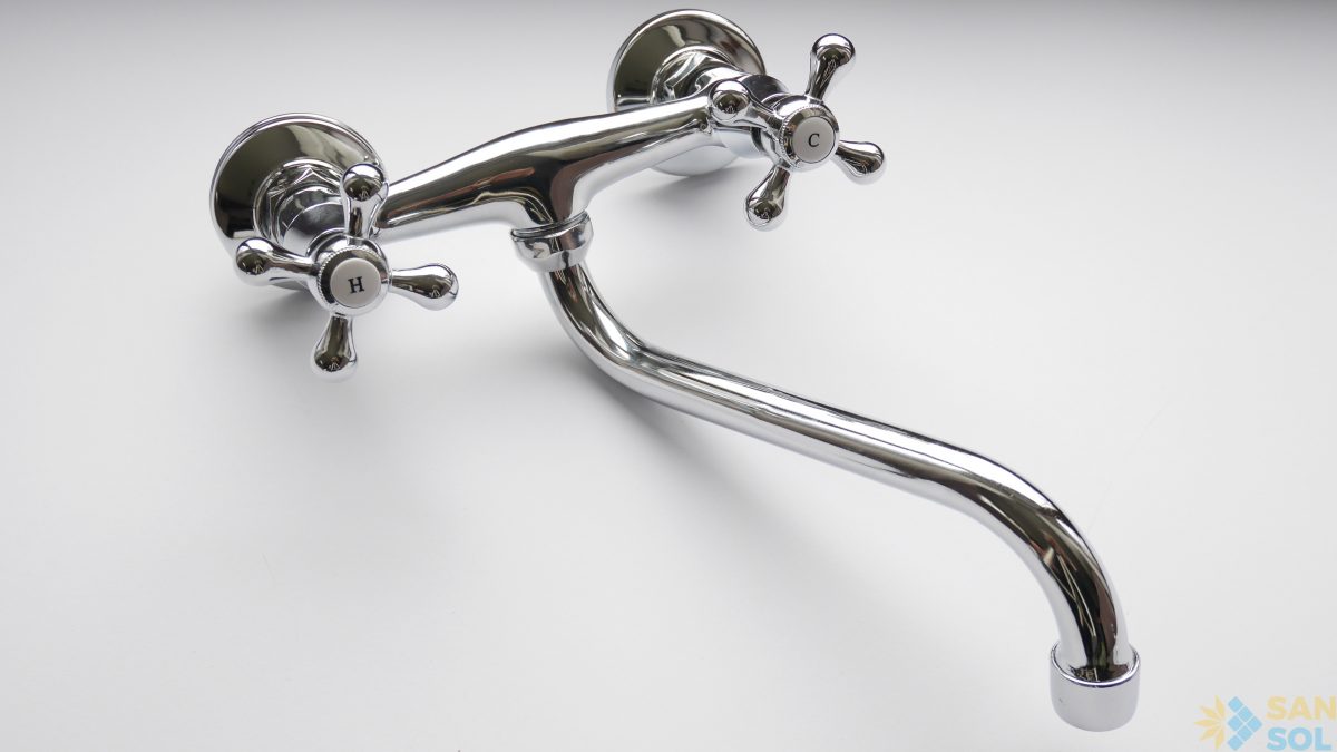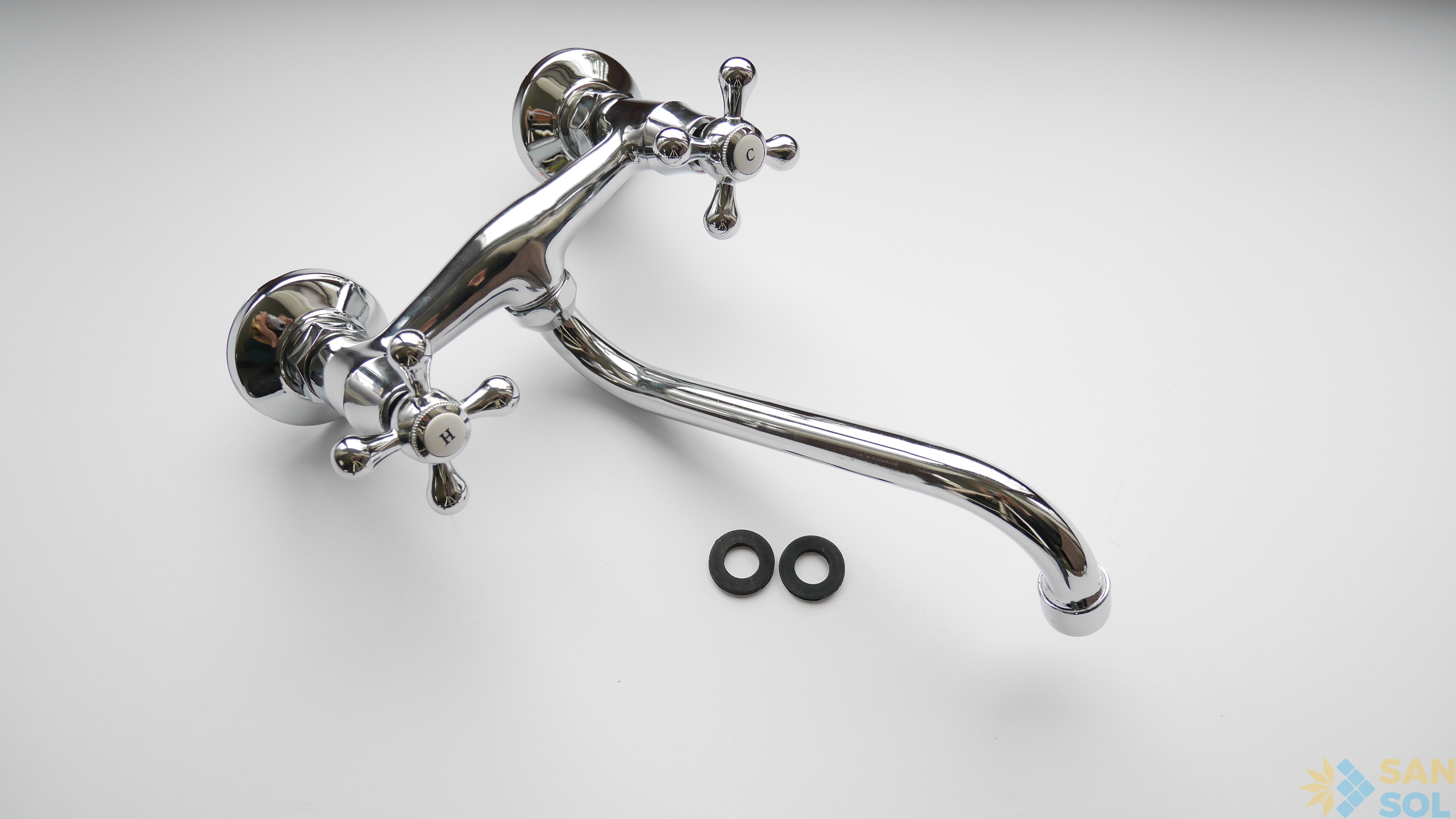 BATERIA ŚCIENNA NA POKRĘTŁA RETRO STANDARD, wykonana z mosiądzu, w kolorze CHROM/POŁYSK, o bardzo klasycznym uniwersalnym wyglądzie , z wylewką o długości 20 cm, w komplecie z rozetami, krzywkami i uszczelkami.