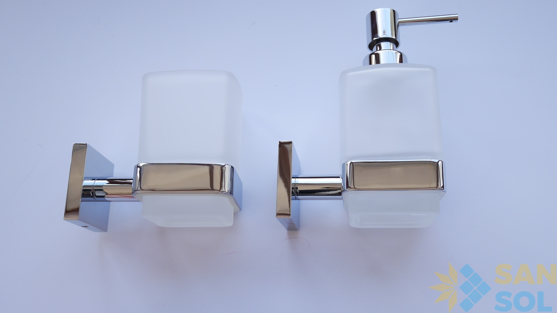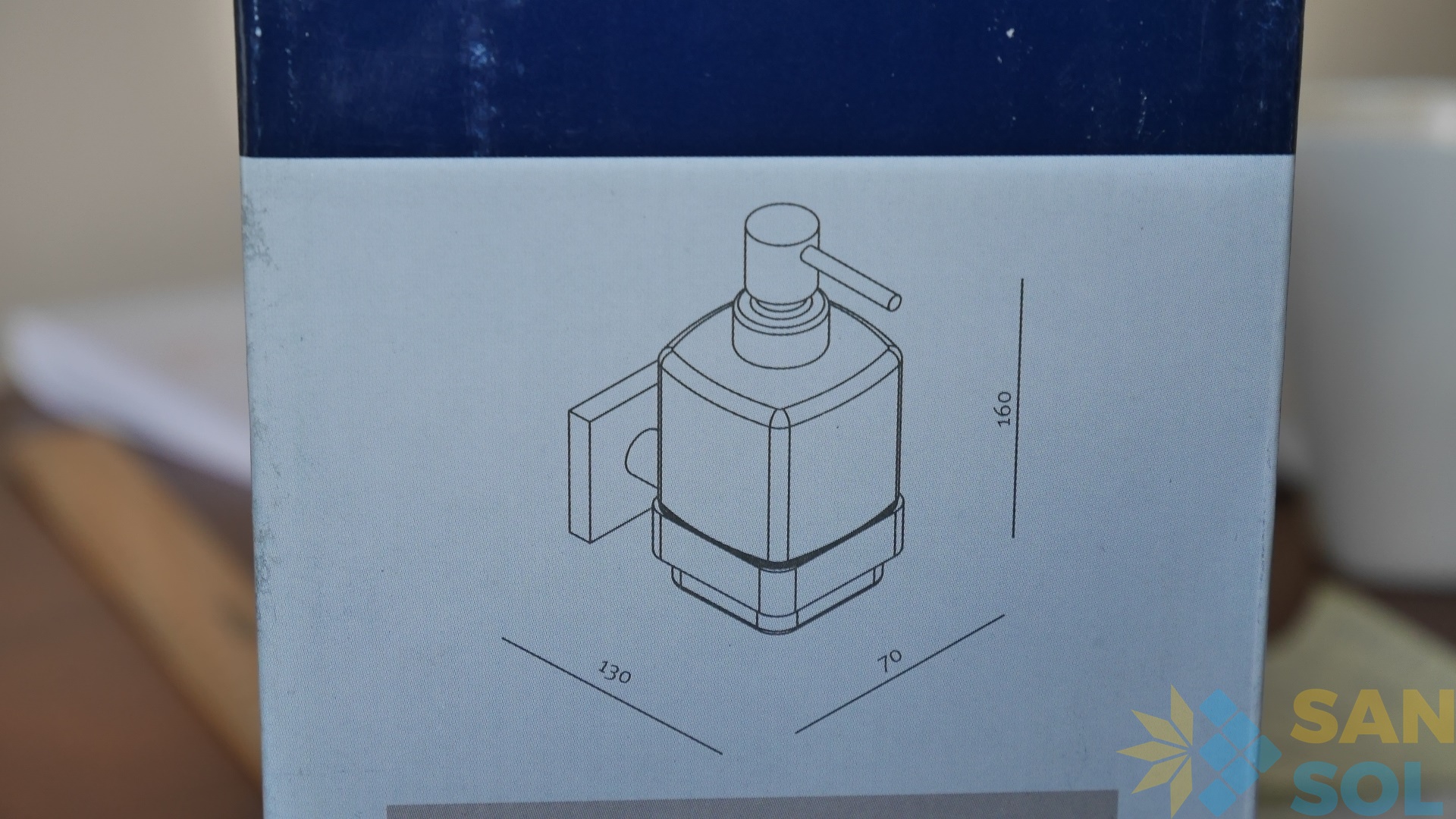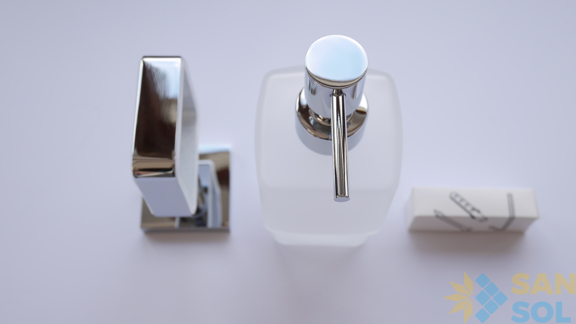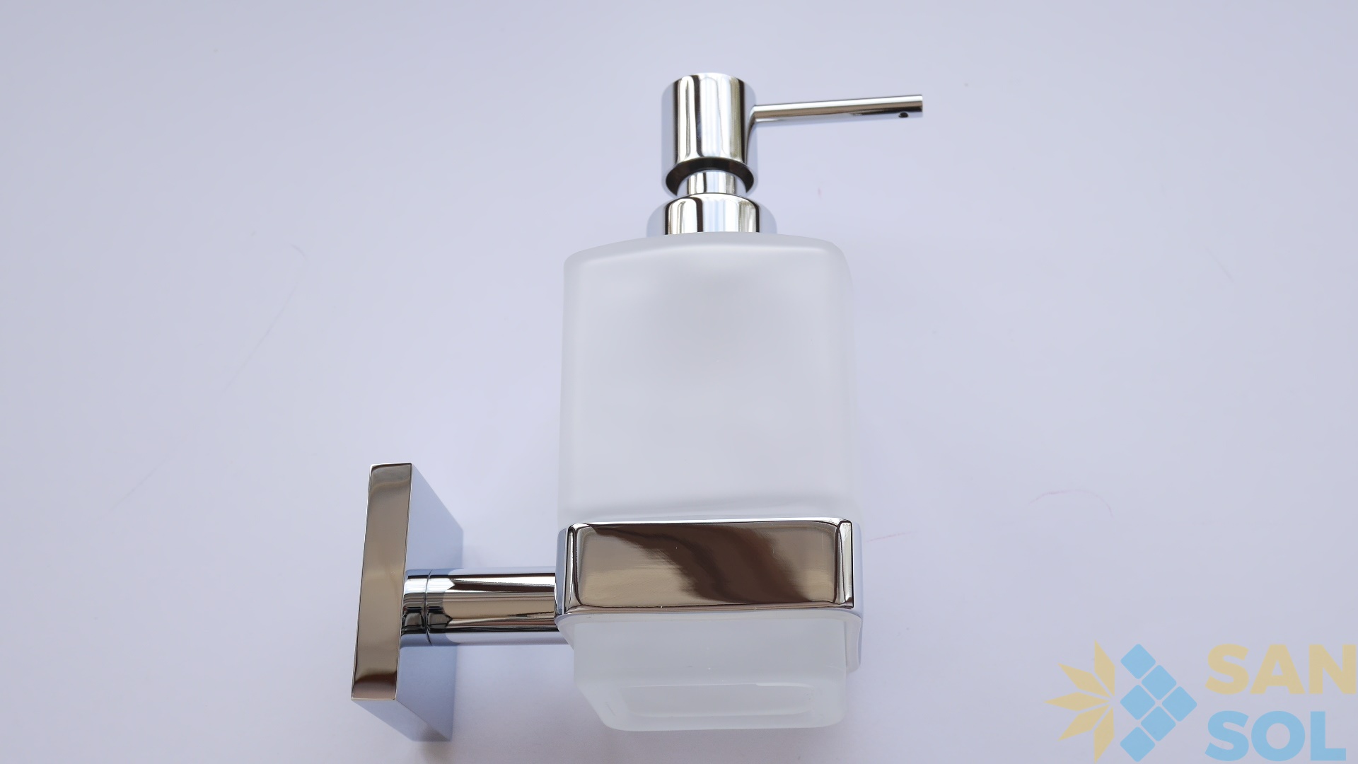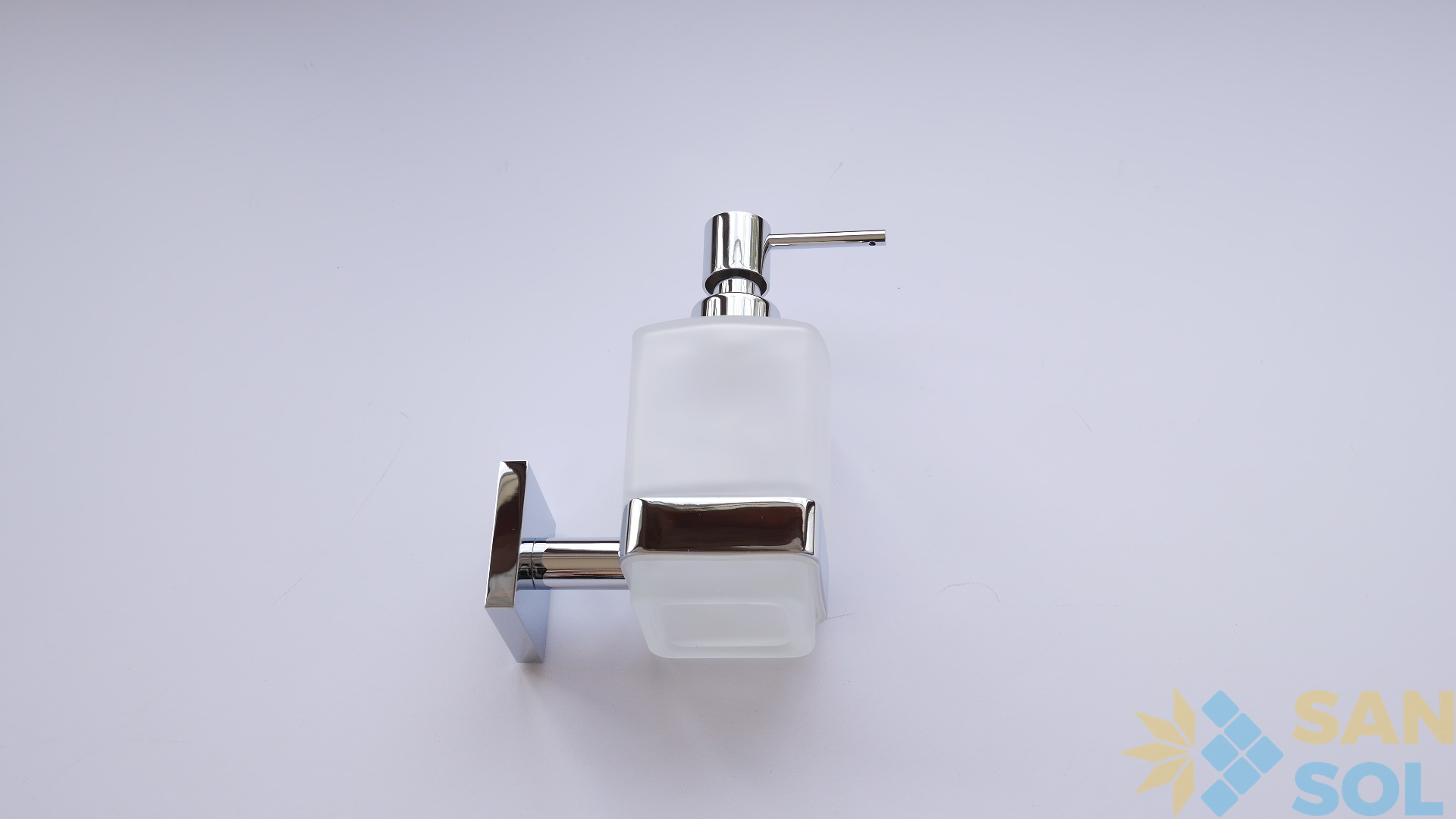 POJEMNIK NA MYDŁO W PŁYNIE Alterna, wykonany ze szkła mlecznego, uchwyt wykonany  z mosiądzu, chromowany – odporny na korozję, posłuży wiele lat, wymiary 13cm/ 7 cm/16 cm, elegancki geometryczny design.