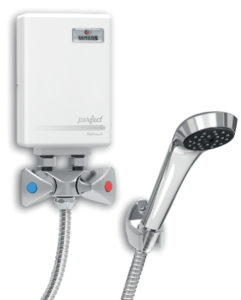 Przepływowy ogrzewacz wody Perfect 450P, elektronik przeznaczony do montażu w kabinach prysznicowych. Wyposażony w zestaw natryskowy z słuchawką natryskową posiadającą odpowiednio dobrane otwory perlatora. Pozwala to na uzyskanie odpowiedniego strumienia wody w stosunku do wydajności grzejnej ogrzewacza. Ogrzewacze Perfect 450P elektronik posiadają obudowy zapewniające stopień ochrony przed oddziaływaniem wody IP25. Oznacza to, że ogrzewacz jest strumienioszczelny, czyli podczas polewania go wodą nie zachodzi obawa porażenia prądem.